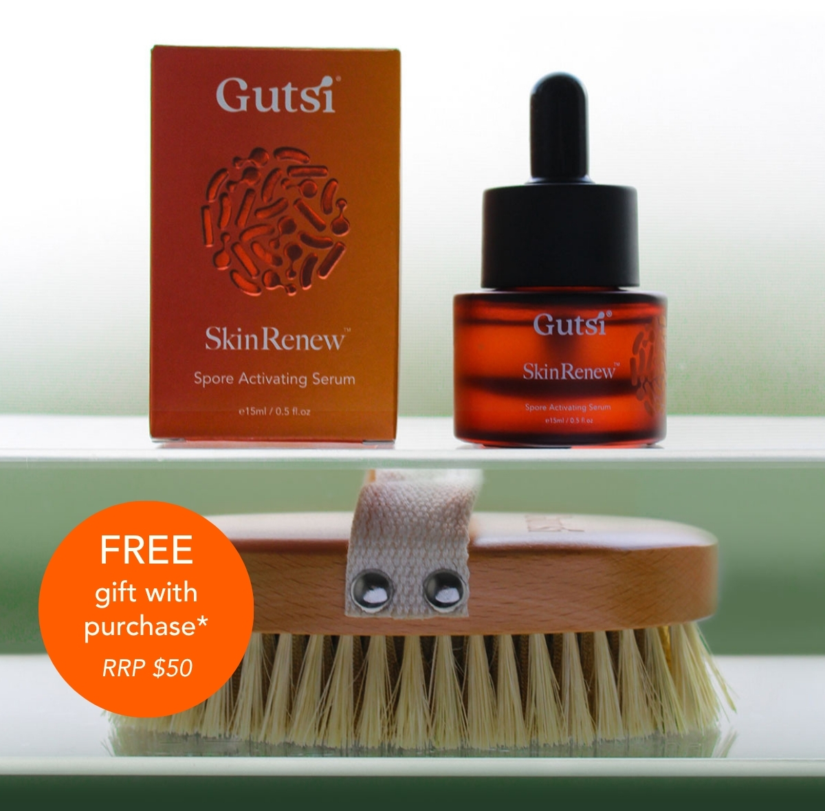 Gutsi® SkinRenew™ is a biome balancing elixir uniting advanced spore science with skin harmony in a ritual where science and beauty become one.