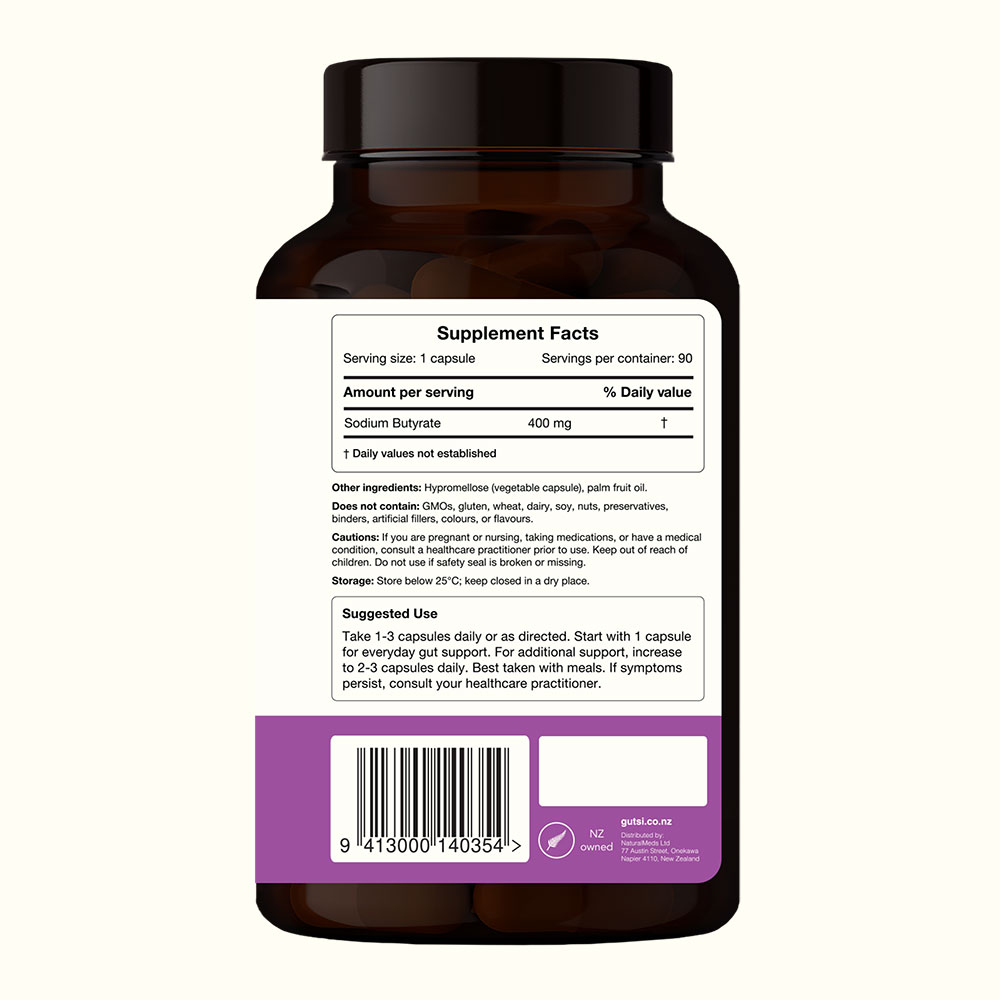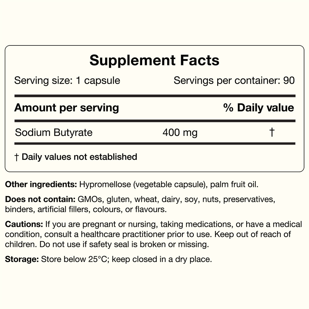 Each capsule delivers 400 mg sodium butyrate, providing 320 mg of active butyrate. The sodium component acts as a stabilising carrier and is present in a small amount comparable to naturally occurring sodium in whole foods.