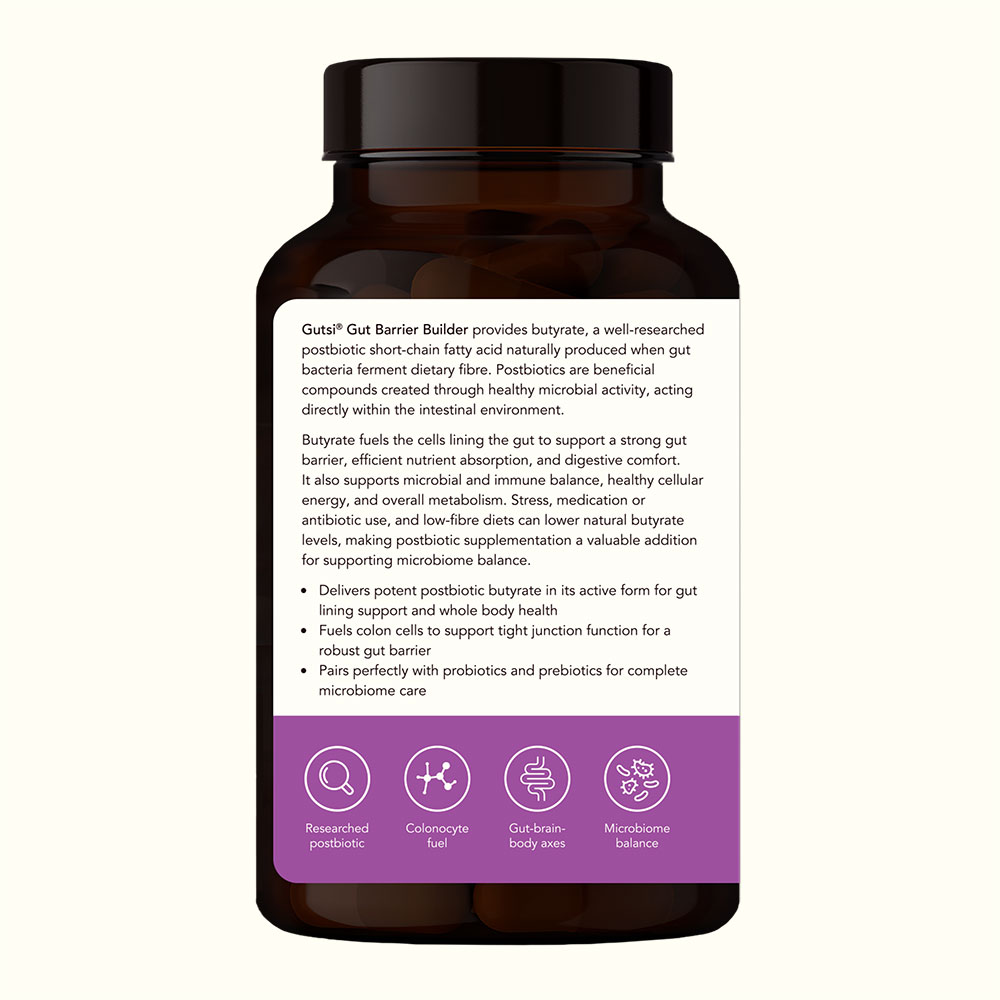 Gutsi® Gut Barrier Builder delivers postbiotic butyrate to support digestive, metabolic and immune function. Go straight to the fuel your gut relies on.